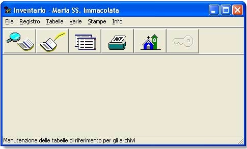Questo modulo di programma è realizzato per la registrazione dei beni di proprietà della parrocchia (mobili, arredi, macchine d'ufficio, suppellettili, quadri, statue, vasi sacri, paramenti, ecc.) utilizzando un numero progressivo di identificazione inventariale.